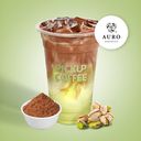 Creamy milk with rich pistachio, Auro’s 100% Natural Cacao Powder, and bold espresso, over ice.