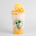 For reference: A refreshing mix of crushed ice, sweet fruits, and creamy toppings in a bowl.