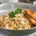 It was salty and nothing like the picture. Aglio e olio should be pasta drenched in a garlic-infused oil. This was nothing like that. Looked more like a pesto pasta than aglio e olio.