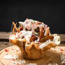 Delightful twist on the classic nachos, featuring crispy pita chips topped with a flavorful combination of ingredients such as melted cheese, savory meats, fres
