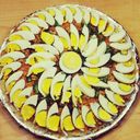 For reference: Noodles topped with savory sauce, shrimp, and garnished with hard-boiled eggs and herbs.