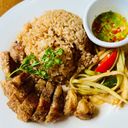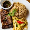 Stir fried BAGOONG rice with Grilled thigh boneless chicken marinated with thai herbs & spices serve with Thai nam jim jaew dipping sauce and papaya salad comes with FREE soft drinks