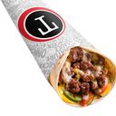 For reference only: Juicy beef wrapped in warm pita bread with fresh vegetables and sauce.