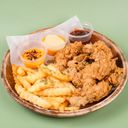 Chicken Bites, French Fries and cheese, buffalo, chili cheese sauce