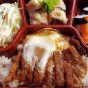 For reference: A flavorful rice bowl topped with breaded meat, egg, and savory sauce, served in a box.