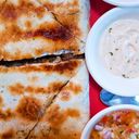 Mexican style beef with vegetables and mozzarella cheese in a toasted tortilla, served with cheese and chili sauce