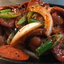 Delicious Deep fried pork belly and tofu tossed with oyster sauce, bell pepper and onion leeks and spices.
