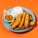 Crispy chicken tenders dusted in creamy salted egg with a hint of chili, served over hot steamed rice.