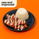 Crispy chicken tenders drizzled with rich, creamy garlic aioli sauce, served over hot steamed rice.